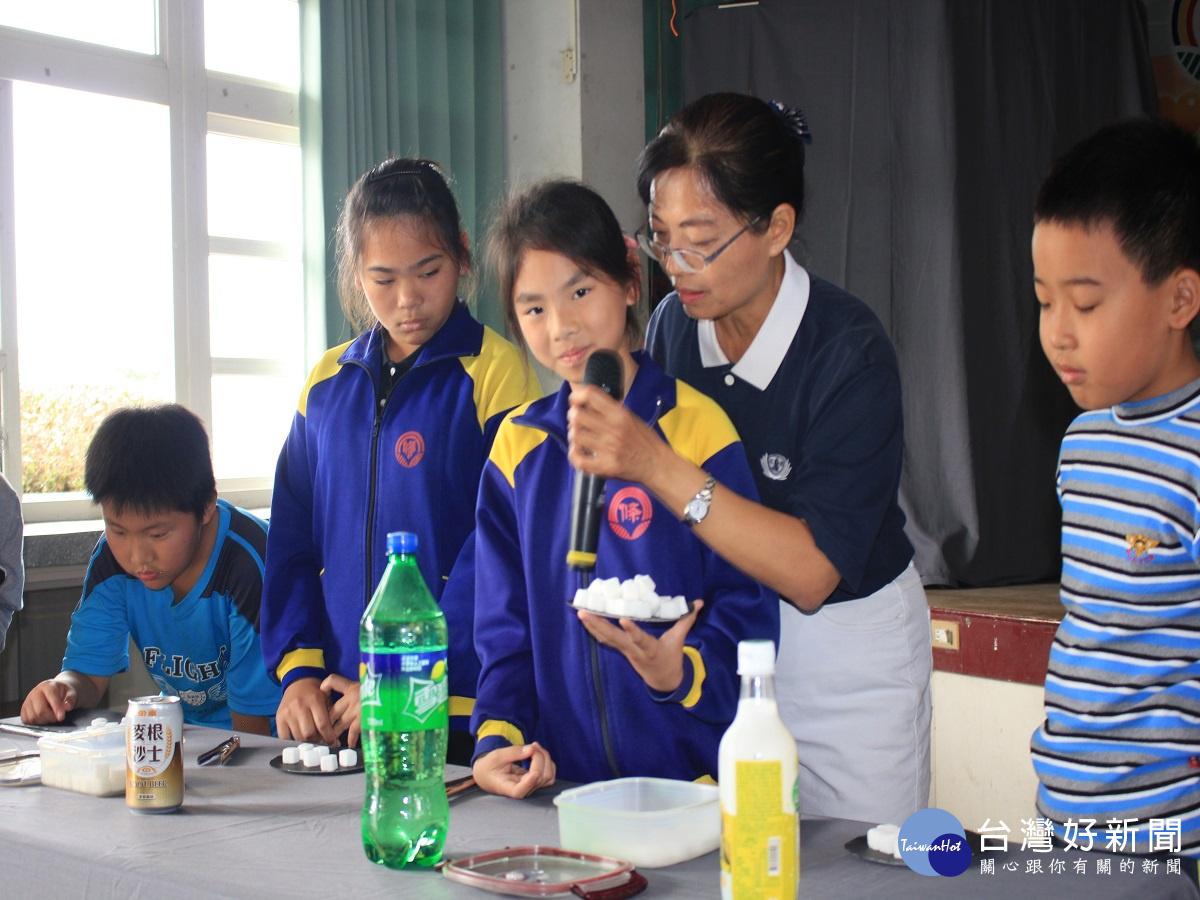 守護兒童健康 多管齊下身材壯碩的六年料同學,平時都是阿嬤在照顧,上臺參與體驗活動後才知道,平日很喜歡喝的「冰鎮」飲料,小小一瓶竟含有十顆方糖,他說:「原來白開水才是最好的飲料,今天上完課之後,我知道要少喝飲料,也希望能夠減肥。」