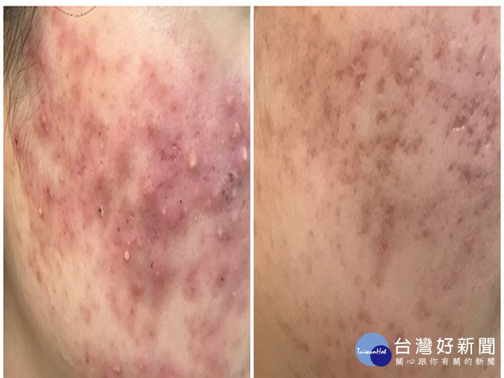 吃冰滿臉青春痘治療前( 左)後比較。林重鎣翻攝 …