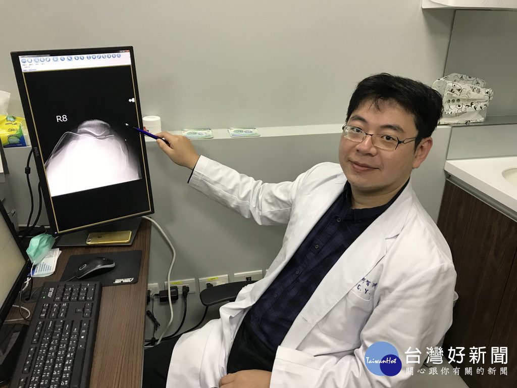 醫師指著車禍受傷膝蓋。林重鎣攝 57歲家住南投、…